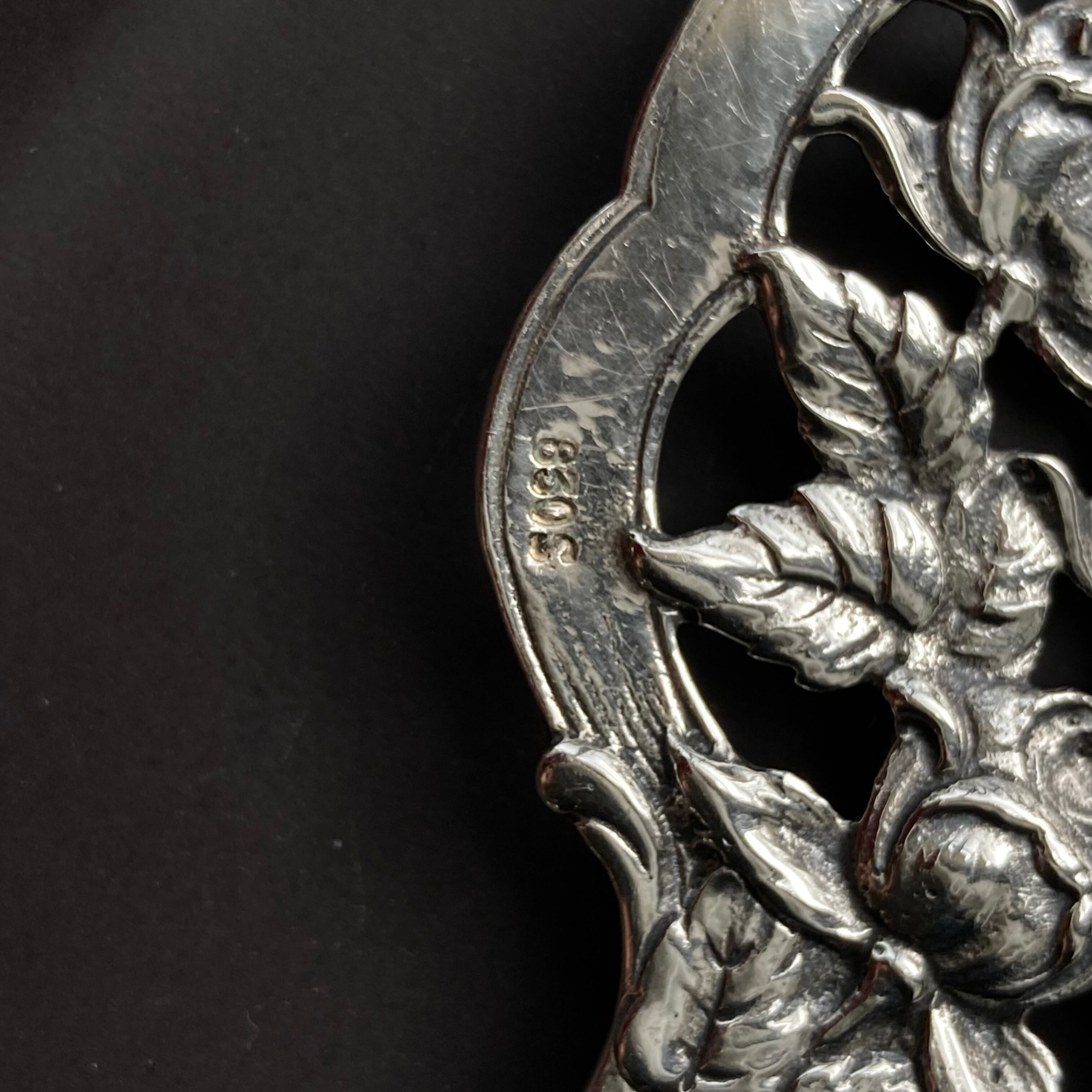 刻印はサーバー台縁に、【S】と830があります。S はスウェーデン製という刻印、シルバー830の純銀製だと確認できます。