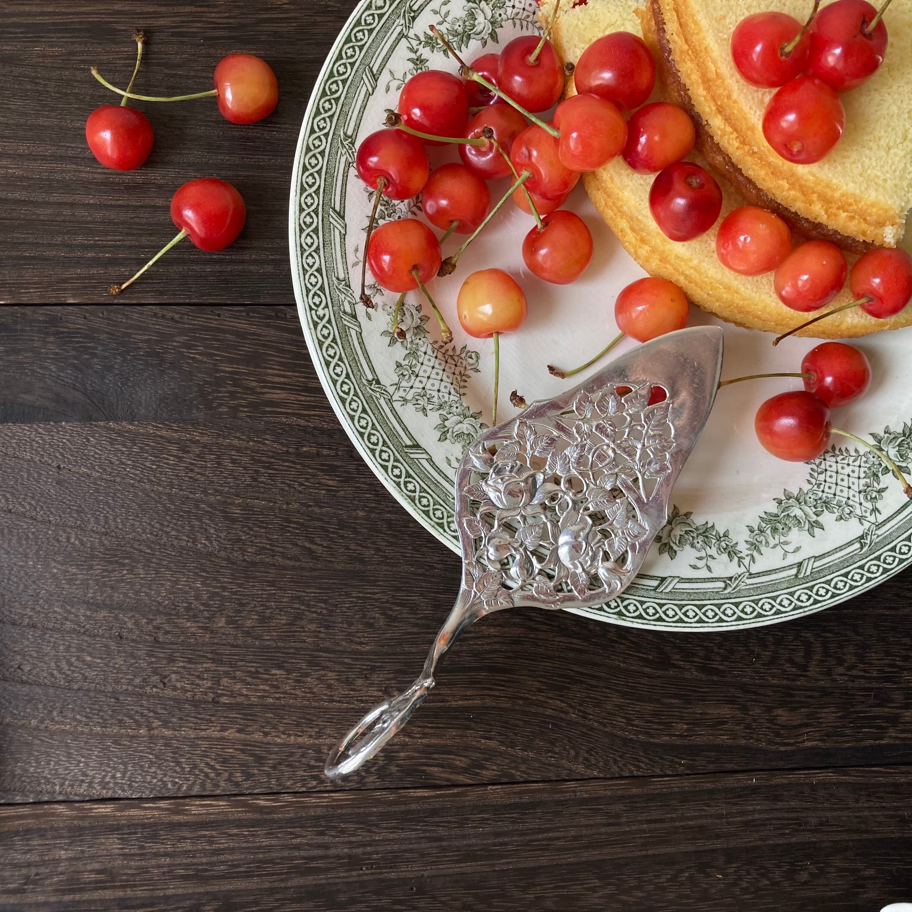 全体的に豪華な透かし彫りが施され、繊細な美しさとなっております。躍動感ある蔦と葉がローズの力強さを表し、ふっくらとしたローズがとっても魅力たっぷりです♡そして、希少なリンググリップにもローズが施され至れり尽くせりな装飾となっております。シルバーの厚みもいう事なし‼︎なので、しっかりとケーキなどを運べる実用性もあります。