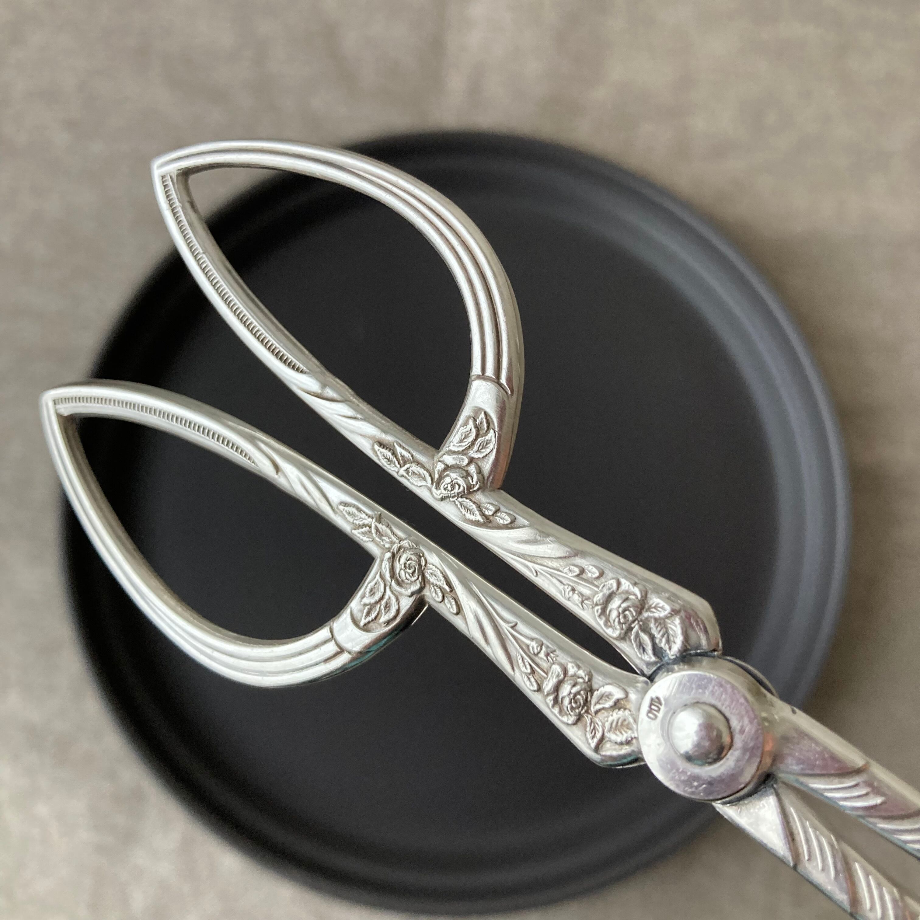 掴みやすさ重視デザインのようであり、実用性高いお品。ローズモチーフがポイントで、上品な出立ちを感じるトングでございます。